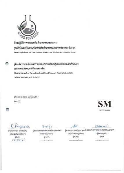 The Eastern Agricultural and Food Innovation Research and Development Center, Faculty of Agricultural Technology, participates in the ESPRel Project under the National Research Office. This initiative requires laboratories to establish a Laboratory Safety Standards Committee, maintain waste management system manuals, and adhere strictly to the guidelines. For example, chemicals must be properly segregated, treated, and disposed of to prevent leakage into water systems and to ensure environmental safety. Additionally, laboratories are evaluated and scored based on compliance with quality certification standards.