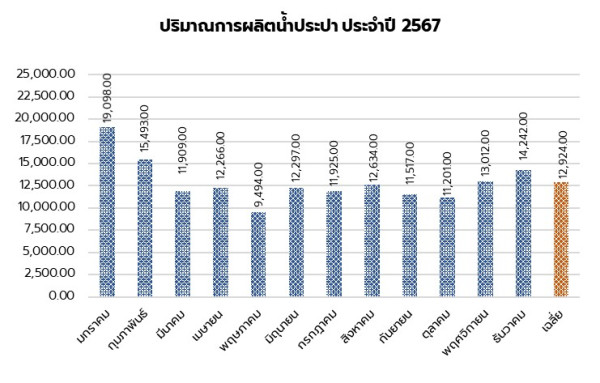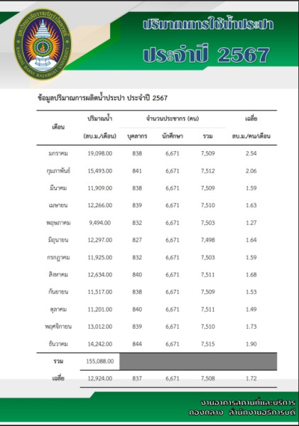มหาวิทยาลัยราชภัฏรำไพพรรณีมีการบันทึกปริมาณการใช้น้ำประปาทุกเดือน ทั้งนี้เพื่อให้รู้ปริมาณการใช้น้ำและสามารถวิเคราะห์การใช้น้ำประปารวมถึงพฤติกรรมการใช้น้ำประปาในช่วงเวลาต่าง ๆ และสามารถคำนวณค่าเฉลี่ยการใช้น้ำของบุคลากรและนักศึกษา โดยในปี 2567 มหาวิทยาลัยมีการใช้น้ำดิบเพื่อนำมาผลิตน้ำประปา จำนวน 155,088.00 ลบ.ม. โดยคิดเป็นค่าเฉลี่ยการใช้น้ำต่อบุคคล ประมาณ 1.72 ลบ.ม./คน/เดือน