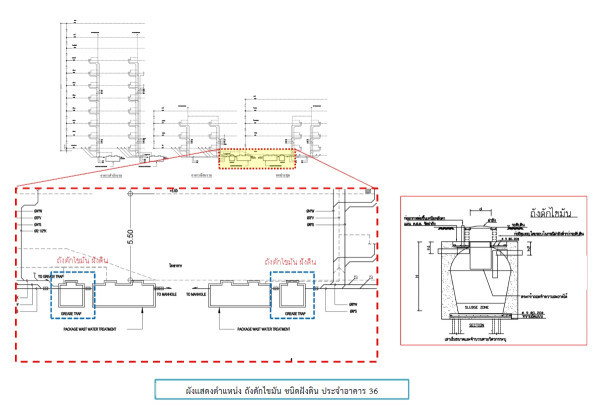 2. การติดตั้งถังดักไขมันและน้ำมัน (Oil and Grease Trap) เพื่อบำบัดน้ำทิ้งจากการล้างภาชนะในอาคาร และการควบคุมน้ำเสียจากอาคารเรียนด้วยระบบบำบัดน้ำเสียแบบติดกับที่ (Onsite treatment) และแบบระบบบ่อเกรอะ (Septic Tank)