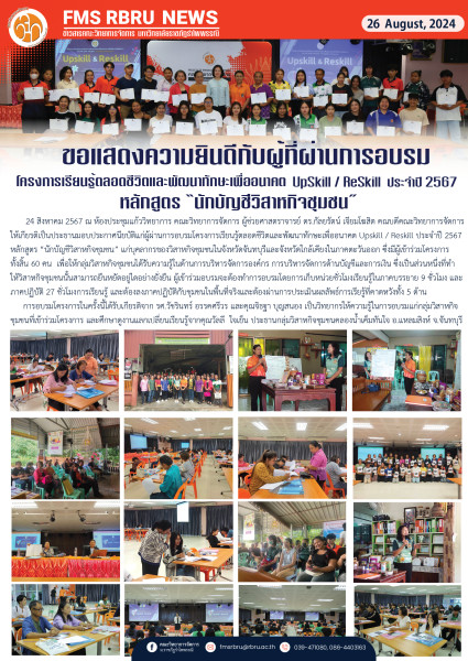 วันที่ 6 กรกฎาคม 2567 คณะวิทยาการจัดการได้จัดโครงการเรียนรู้ตลอดชีวิตและพัฒนาทักษะเพื่ออนาคต (Upskill & Reskill) หลักสูตรนักบัญชีวิสาหกิจชุมชน ซึ่งโครงการนี้ได้รับงบประมาณสนับสนุนจากสำนักงานปลัดกระทรวงการอุดมศึกษา วิทยาศาสตร์ วิจัยและนวัตกรรม (สป.อว.) โดยกลุ่มเป้าหมายเป็นกลุ่มวิสาหกิจชุมชน ผู้สำเร็จการศึกษาระดับ ปวช. ปวส. และบุคคลทั่วไปที่ต้องการพัฒนาศักยภาพเกี่ยวกับการบัญชีวิสาหกิจชุมชน