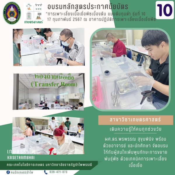 The university supported free training courses on resource management at both local and national levels. Four local courses included Edible Mushroom Cultivation for Communities, Pre-Release Preparation Based on the Sufficiency Economy Philosophy, Local Curriculum Management for Schools, and Learning Activity Design for 21st-Century Skills and Soft Power Promotion, where students developed fragrant cardamom products as local identity resources. Two national courses—Low-Cost Plant Tissue Culture and Biological Laboratory Techniques (Tissue Culture)—equipped participants with knowledge and practical skills for plant propagation. Trainees applied these techniques to increase plant production efficiently and used simple equipment for tissue-culture operations.